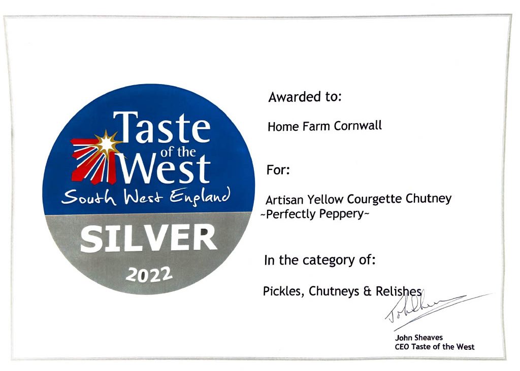Winning a Taste of the West SILVER Award in 2022, our Delicious Perfectly Peppery Courgette Chutney (previous known as Artisan Yellow Courgette Chutney ~Perfectly Peppery~) is lovingly made with our Cornish yellow courgettes.
