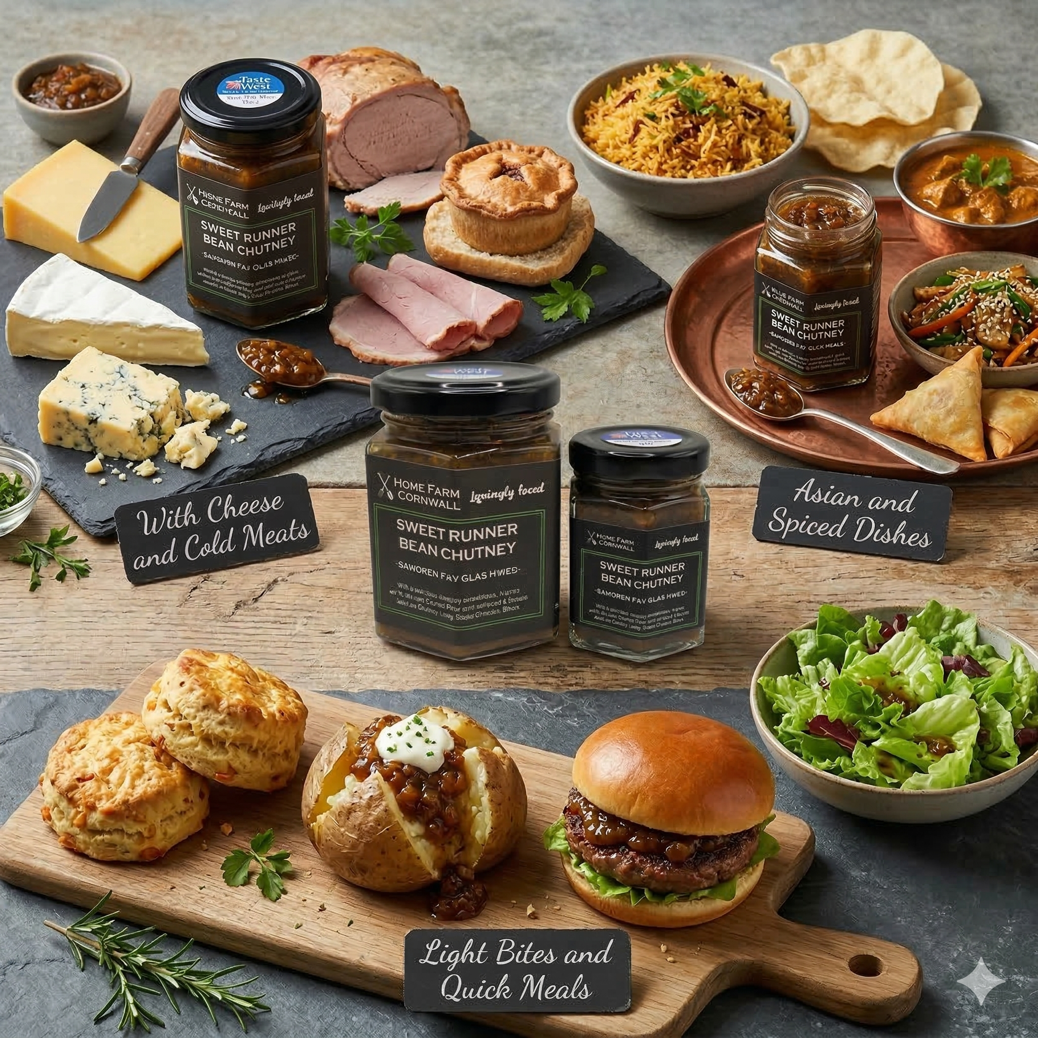 Our Sweet Runner Bean Chutney pairs well with Mature Cheddar, Cheshire, Brie, and Blue cheeses; pork pies, cold ham, or a thick layer on pâté and toast.