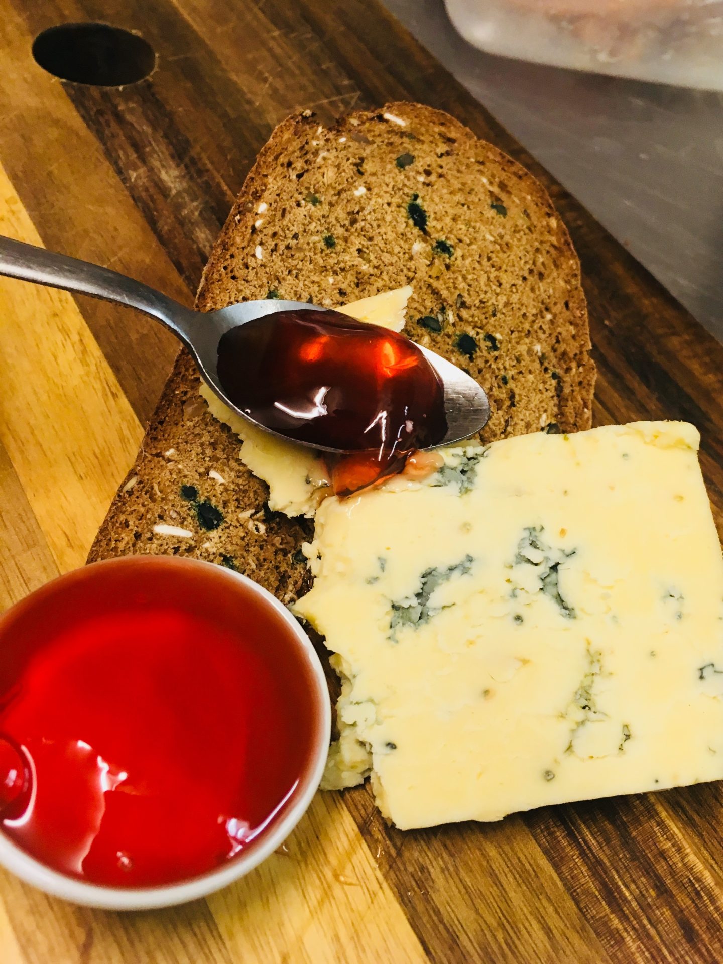 It also pairs really well with a vintage cheddar, the sour group of cheeses such as blues and brie’s, Yarg and Fetta. Enjoy it as a delicious accompaniment with pork, lamb & game. Or simply spread it across hot buttered toast or a crumpet! Yum.